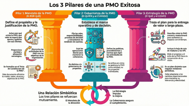 Según la publicación Oficinas de Dirección de Proyectos: Una Guía Práctica (PMI, 2024), una PMO de alto rendimiento se basa en tres pilares: Mandato, Gobernanza y Estrategia.
