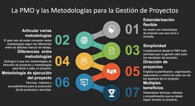 Formas de trabajar: bien sea con un enfoque predictivo, el ágil, hoy en día está muy claro que hay más de una forma de ejecutar los proyectos. Es trascendental que una PMO domine tantas formas de trabajar como puedan, para que la organización pueda aplicar la técnica adecuada en el proyecto oportuno y obtener resultados satisfactorios. Las empresas buscan en todas partes una nueva metodología que resuelva sus problemas, pero cada empresa es diferente y, como tal, cada una necesita una solución dinámica y personalizada. Los proyectos de una organización también son diferentes y cada uno enfrenta un reto distinto y muchas veces la forma metodológica de abordarlo necesita ser diferente. En este punto en particular es donde la PMO debe ser lo suficientemente audaz con una mentalidad flexible centrada en ofrecer valor y beneficios con sus lineamientos metodológicos. En el mercado existen diferentes metodologías y marcos de trabajo para los proyectos: Scrum, Kanban, Lean, XP, Waterfall, PRINCE2 y PMBOK, etc,