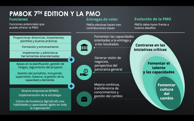 Finalmente, el PMBOK establece que las PMO deben evolucionar constantemente para hacer frente a nuevos desafíos, y esto se logra mediante: